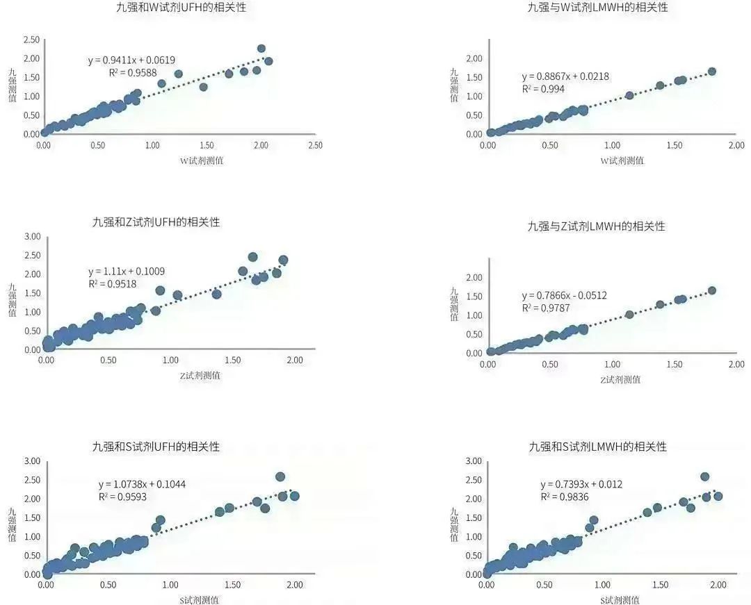 九強抗Xa測定試劑盒(發(fā)色底物法)通過顏色變化來測定抗凝強度/血藥濃度,線性寬,抗干擾能力強,精密度高,與市場主流廠家試劑相關性良好,R2>0.95,可滿足臨床檢測需求。