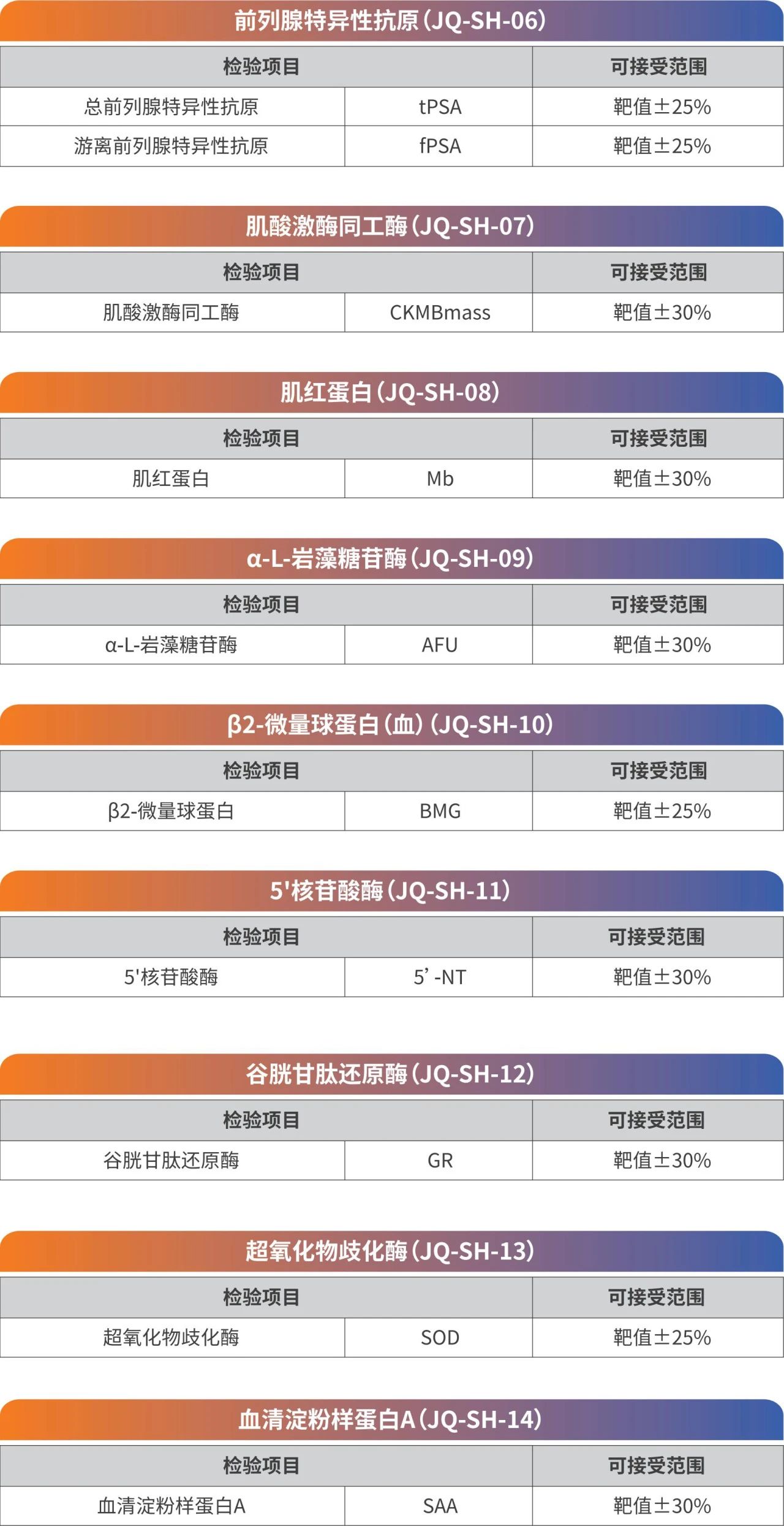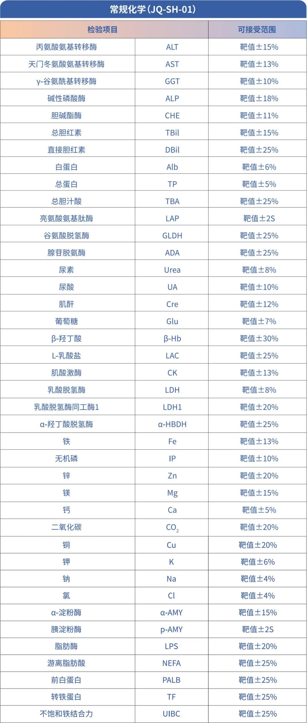 (1)?評(píng)價(jià)項(xiàng)目:γ-谷氨酰基轉(zhuǎn)移酶(GGT)、堿性磷酸酶(ALP)、乳酸脫氫酶(LDH)、肌酸激酶(CK)、α-淀粉酶(α-AMY)、總蛋白(TP)、肌酐(Cre)、尿素(Urea)、尿酸(UA)、葡萄糖(Glu)、同型半胱氨酸(Hcy)、總膽固醇(CHO)等;
