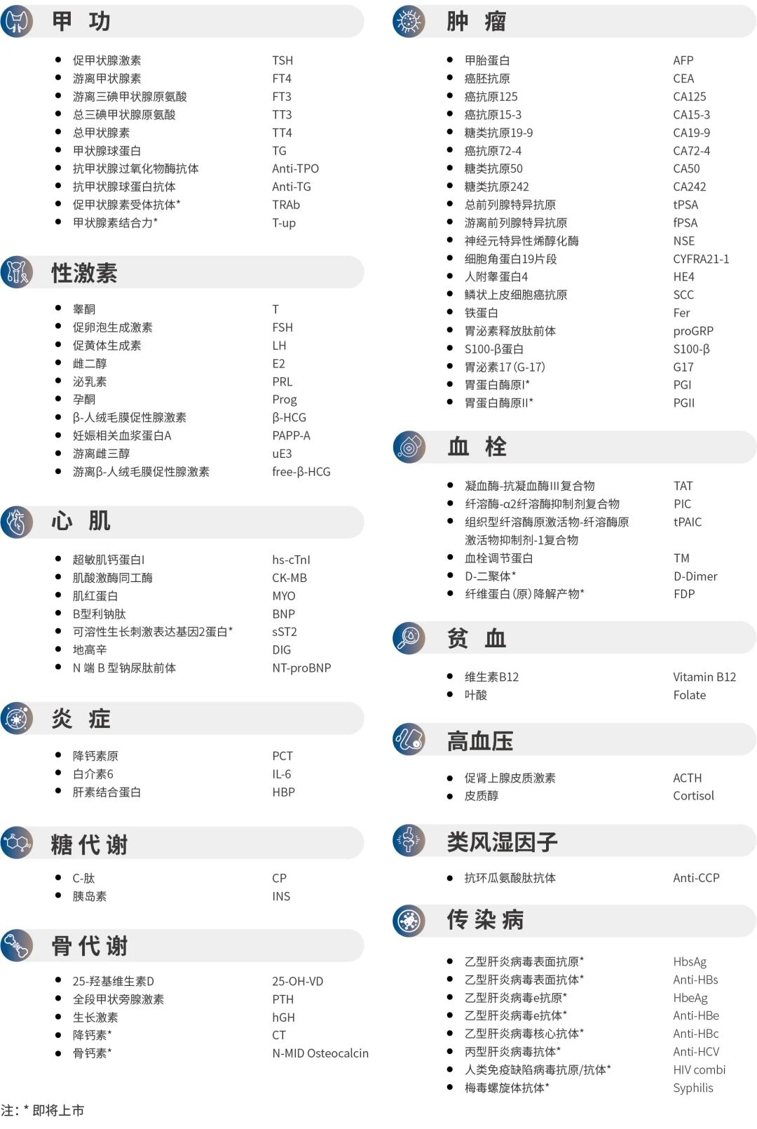 · 覆蓋全面:腫標(biāo)、甲功、心肌、炎癥、性激素、糖代謝等常規(guī)項目